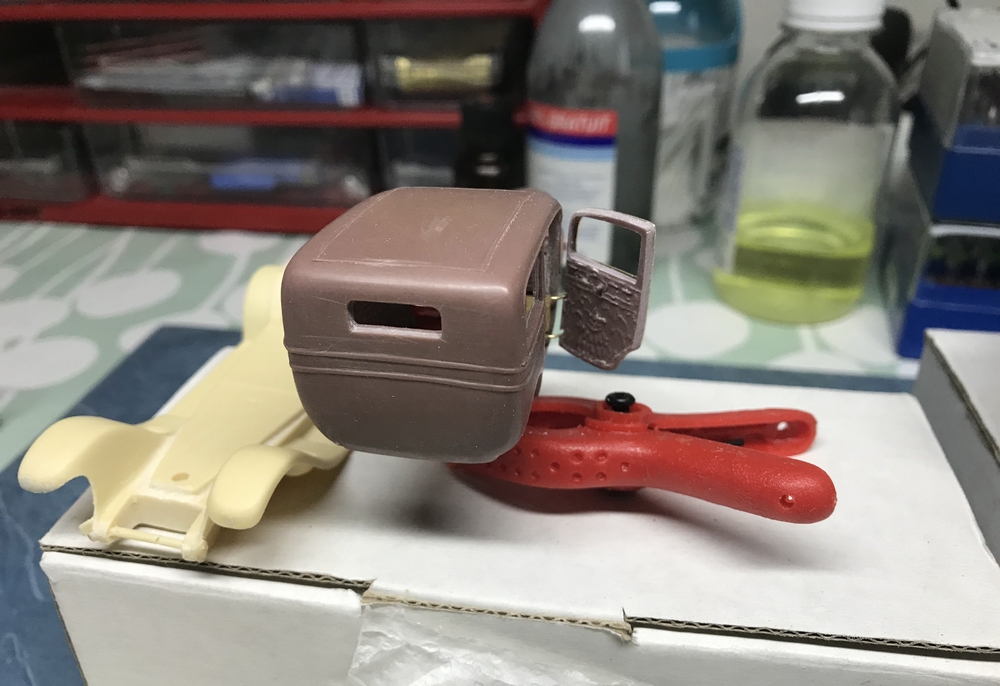 J’ai opté pour une porte que l’on peut laissée soit ouverte soit fermée. L’articulation est faite en fil de laiton tout comme la porte sur laquelle j’ai collé celle en résine du kit mais adaptée.